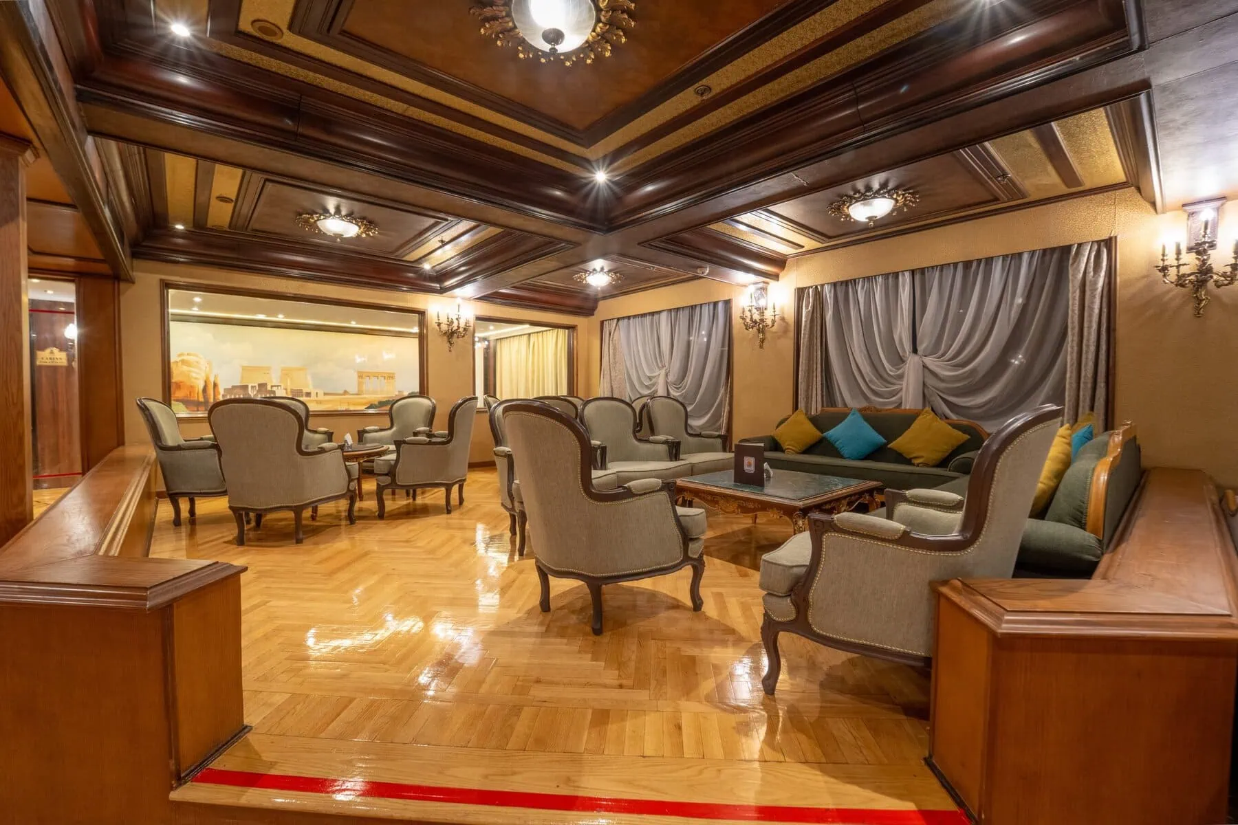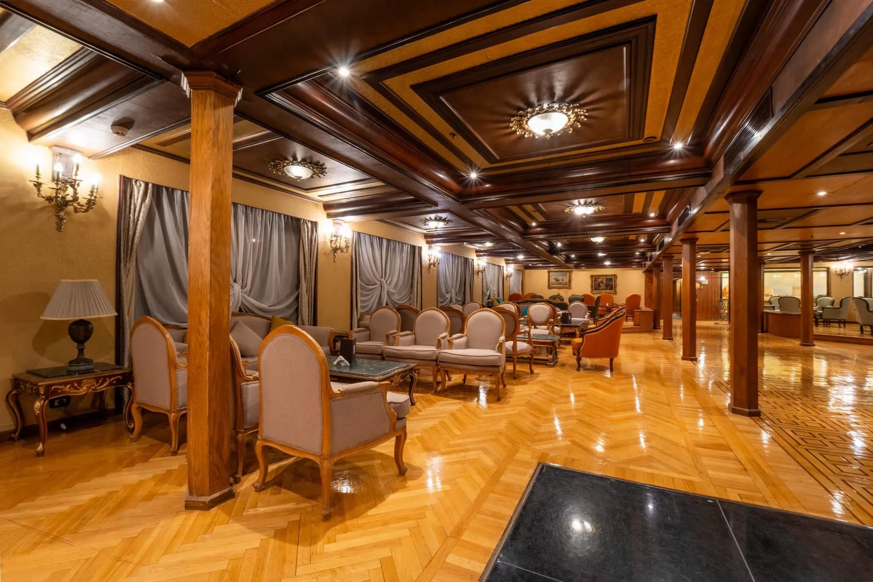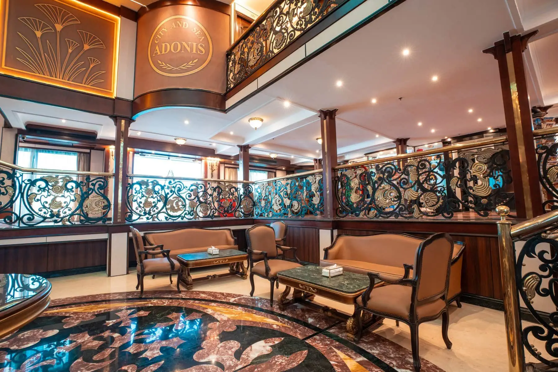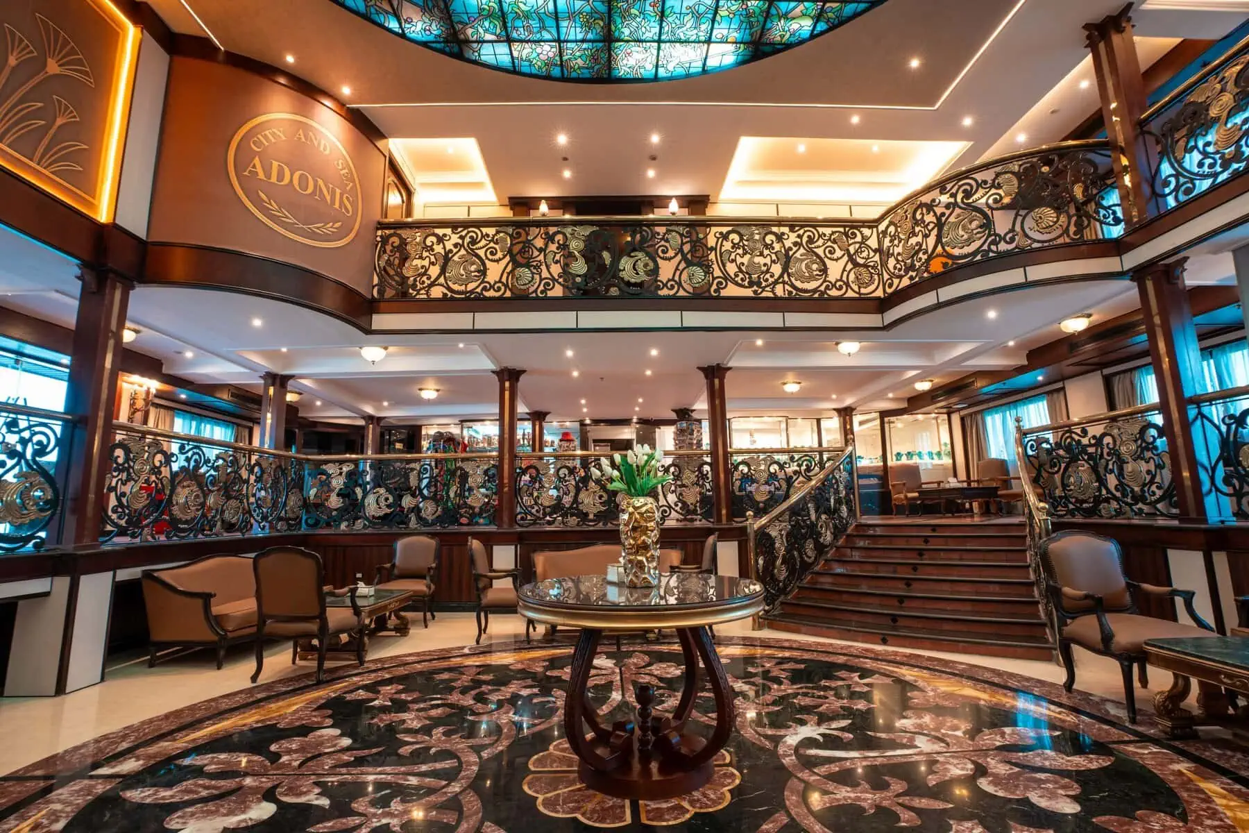 Step into elegance with marble floors, stained-glass lighting, and plush seating — the City and Sea Adonis reception sets the perfect tone for your Nile journey.